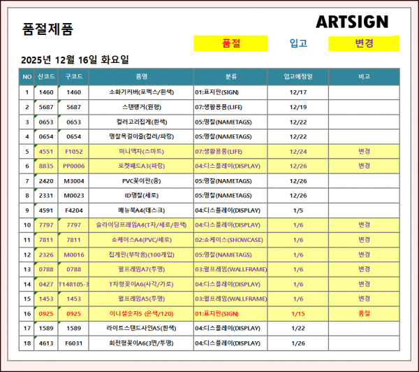 품절 / 변경 ] 2025년 12월 16일