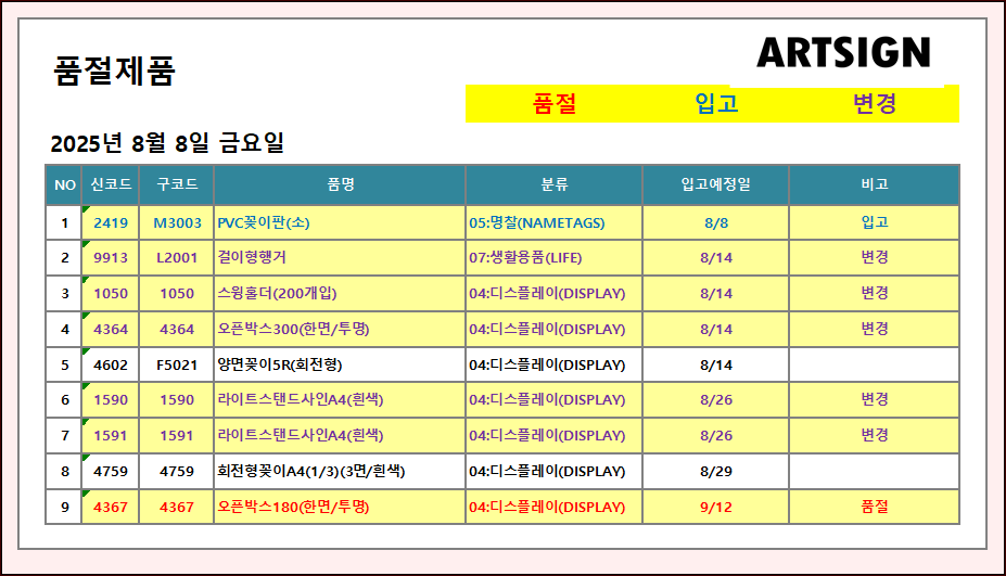 품절 / 입고 / 변경 ] 2025년 8월 8일