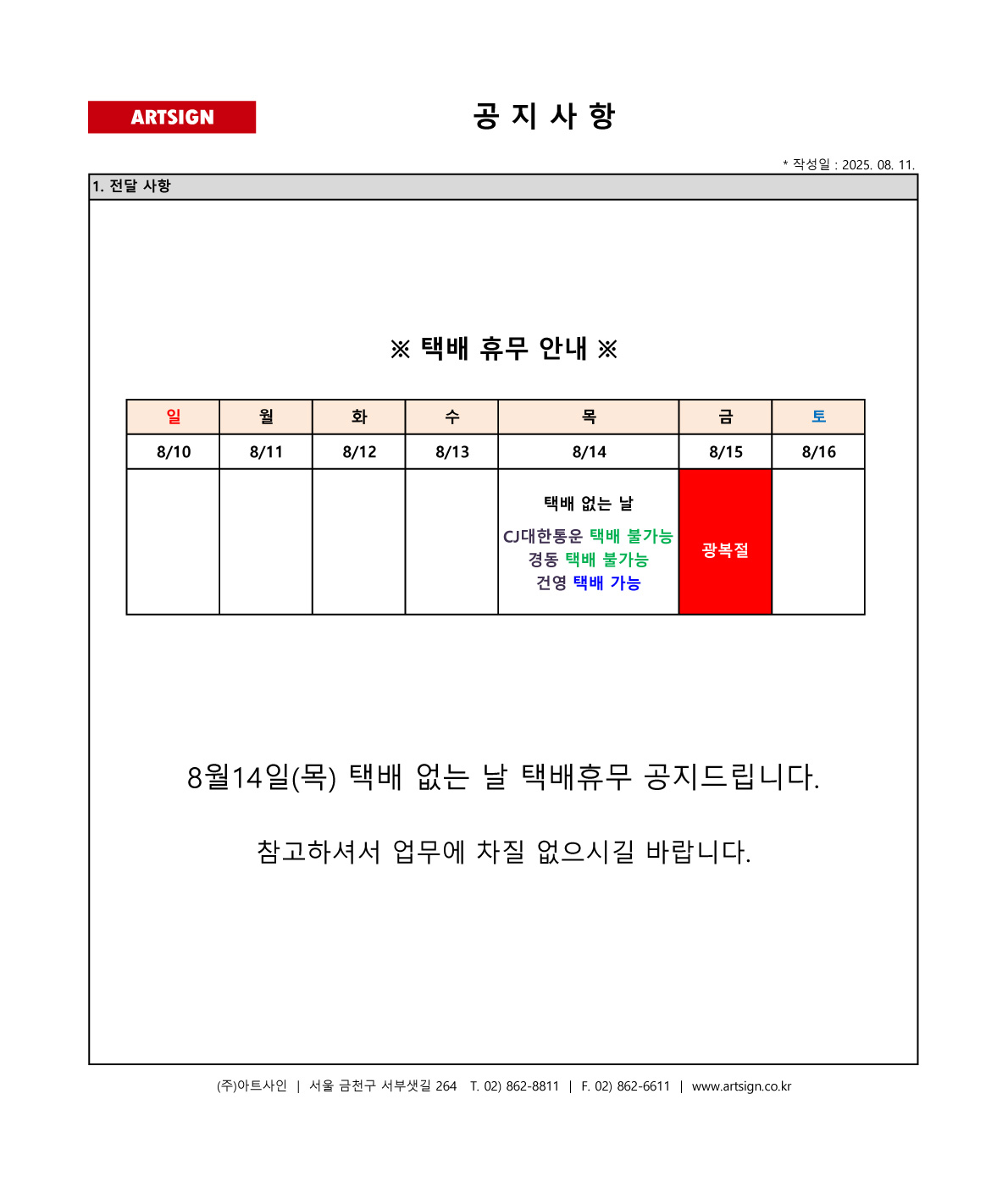 8월 14일 택배 없는 날 / 8월 15일 광복절 휴무 안내 입니다.
