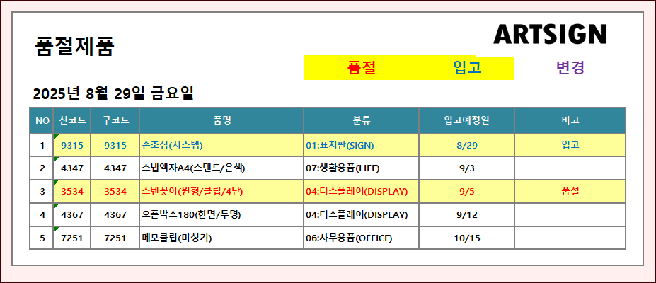 품절 / 입고 ] 2025년 8월 29일