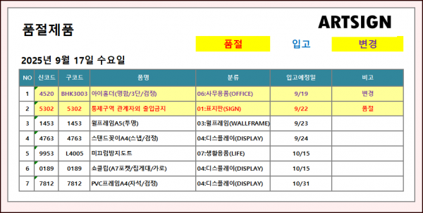 품절 / 변경 ] 2025년 9월 17일