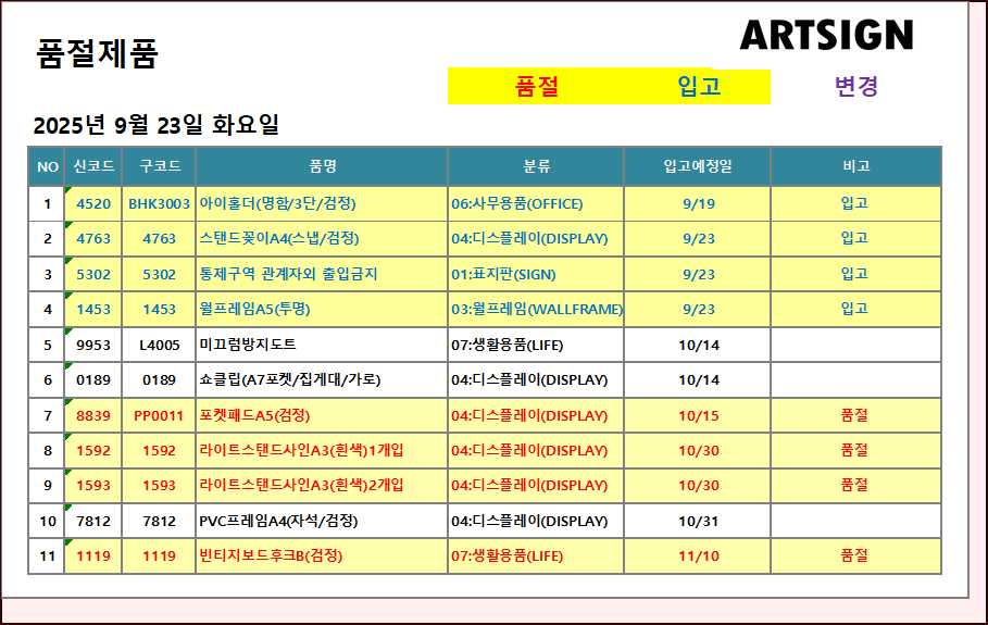 품절 / 입고 ] 2025년 9월 23일