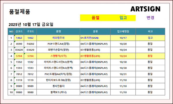 품절 제품과 입고된 제품에 대해 안내 드립니다.