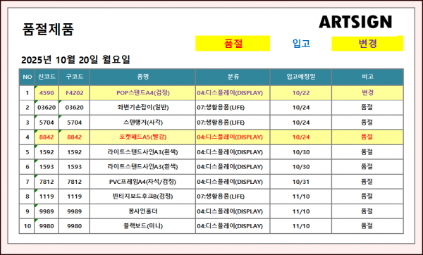 품절 제품과 입고일이 변경된 제품에 대해 안내드립니다.