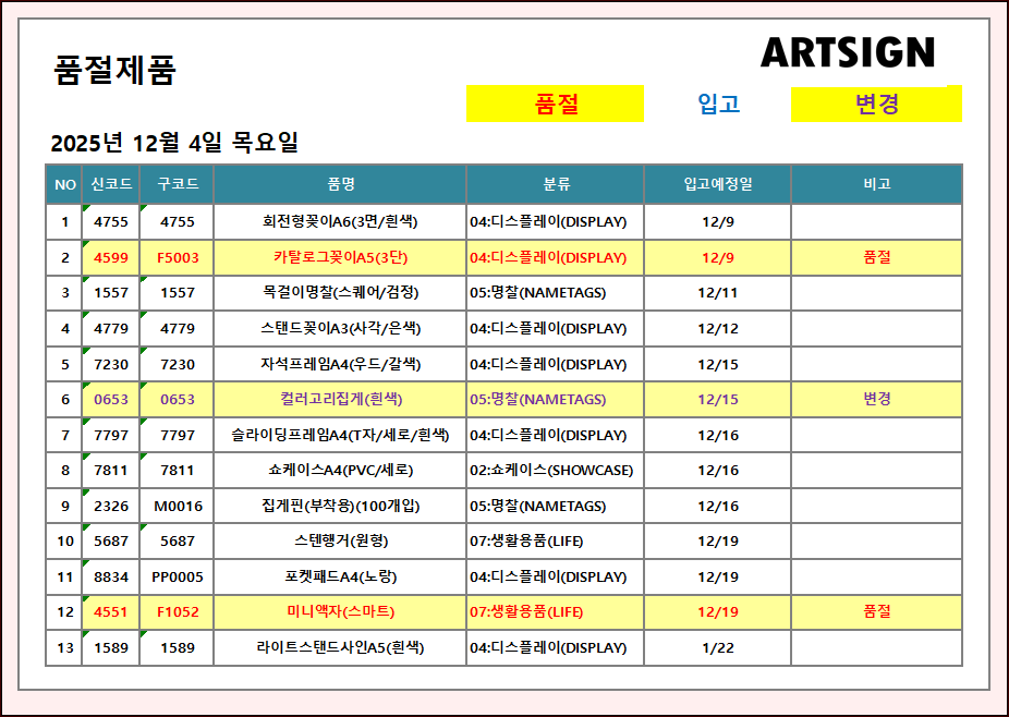 품절 / 변경 ] 2025년 12월 4일