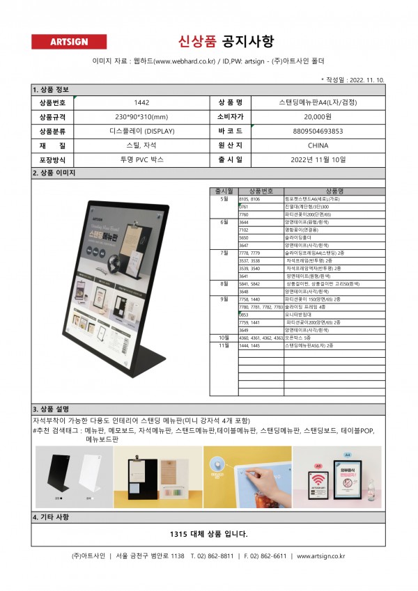 신상품 ] 스탠딩메뉴판A4(L자/검정) 출시