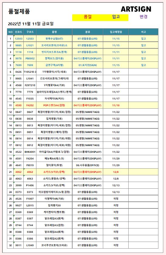 품절제품과 ㅇ비고된 제품에 대해 안내드립니다.