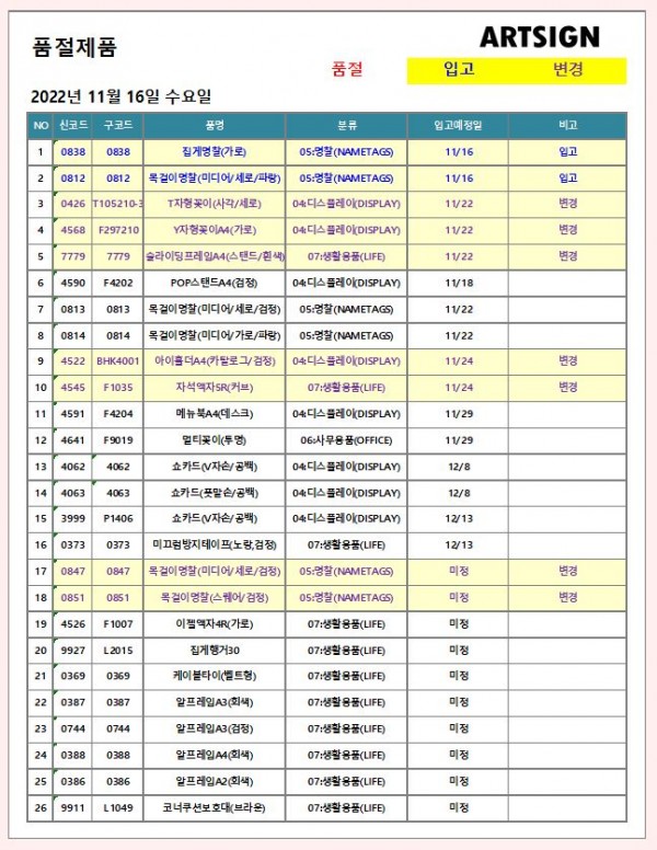 품절제품중 입고된 제품과 입고일이 변경된 제품에 대해 안내드립니다.