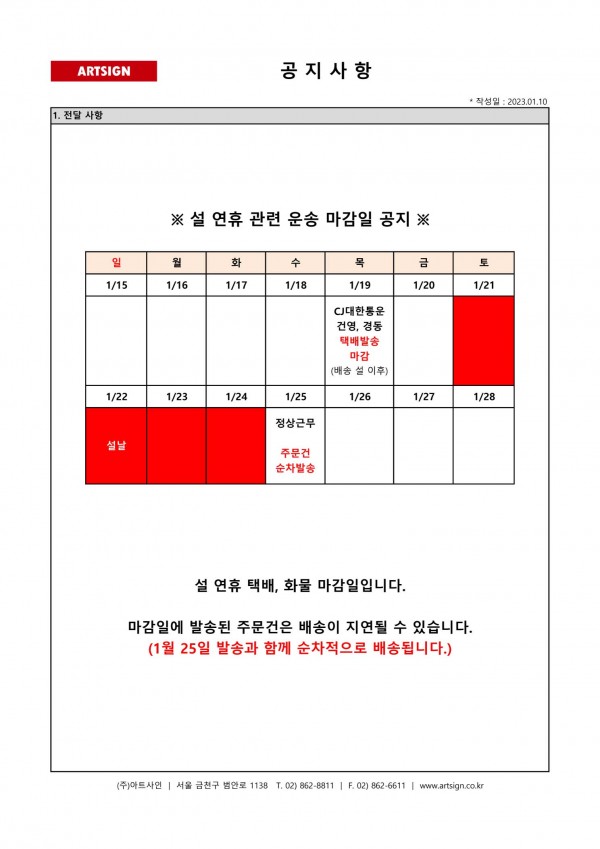 마감공지] 2023 설 연휴 운송 마감 공지입니다.