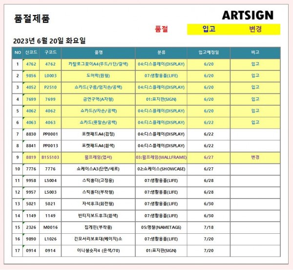 입고 / 변경 ] 2023년 6월 20일