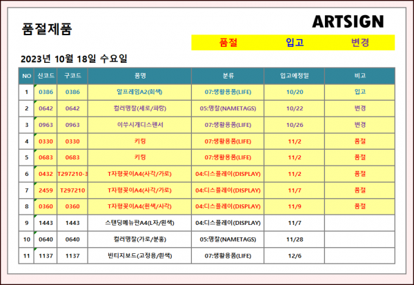 품절 / 입고 / 변경 ] 2023년 10월 18일