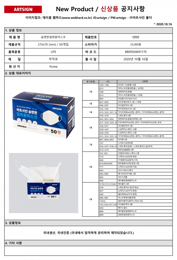 신상품] 숨편한 일회용 마스크 출시