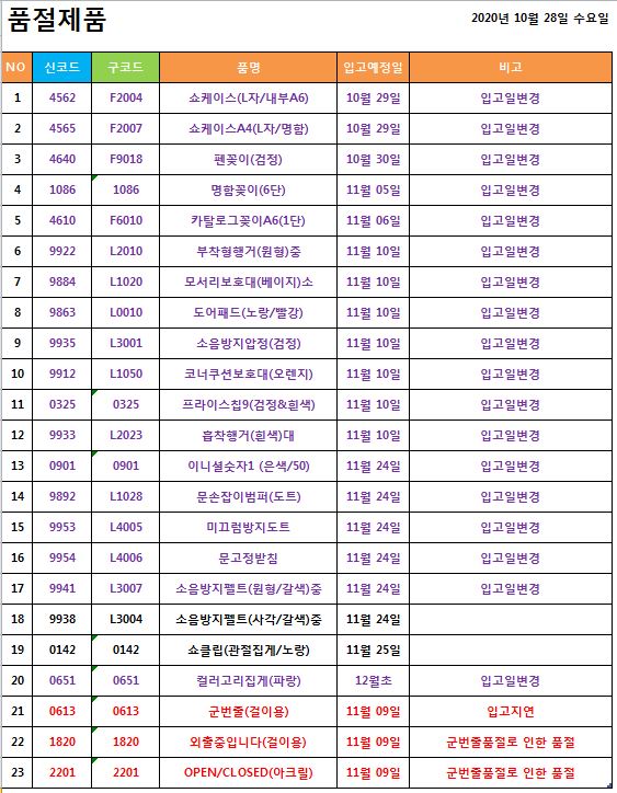 품절제품과 입고일이 변경된 제품에 대해 안내드립니다.
