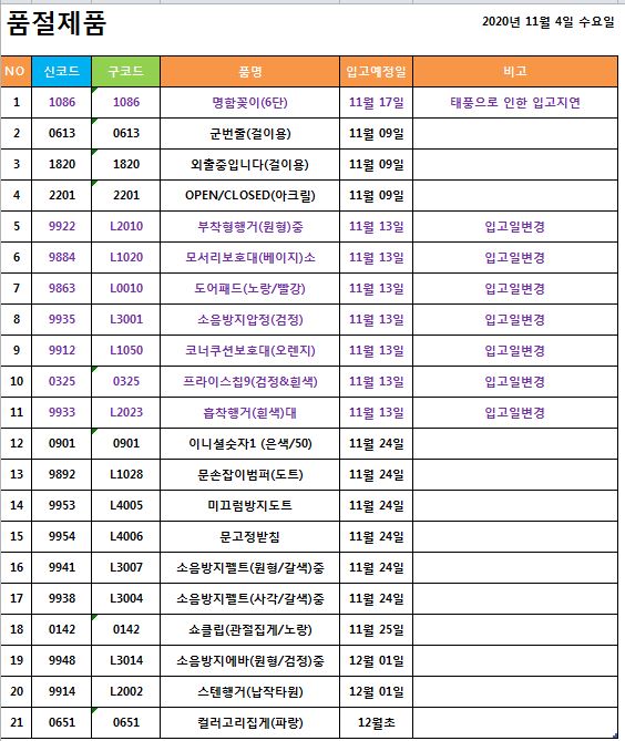 품절입고 / 입고일변경 ] 2020년 11월 4일