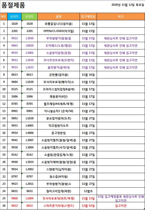 품절제품과 입고일이 변경된 제품에 대해 안내드립니다.