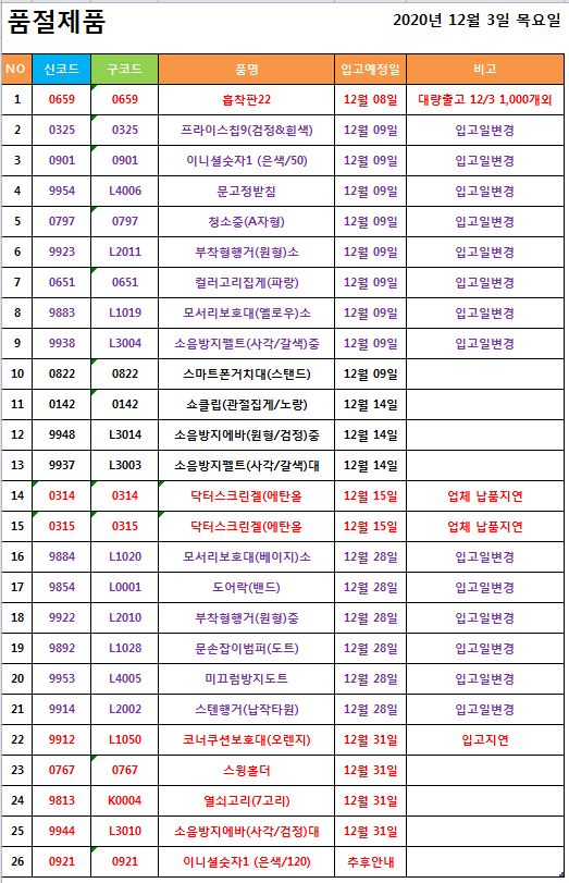 품절 / 입고일변경 ] 2020년 12월 3일