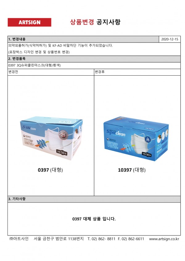 상품변경] 0397 3Q슈퍼클린마스크(대형/흰색)_ 대체상품 공지