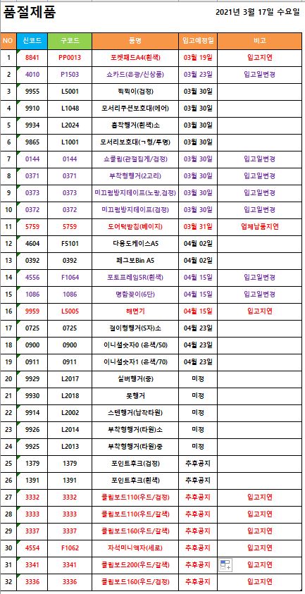 품절 / 품절입고 / 입고일변경 ]2021년 3월 17일