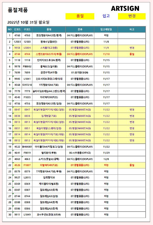 품절제품과 입고일이 변경된 제품에 대해 안내드립니다.