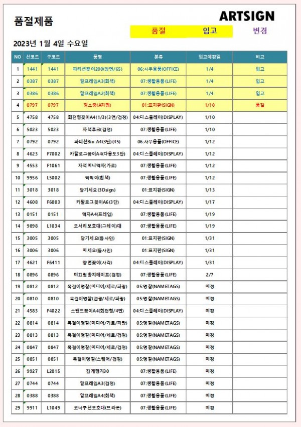 품절 / 입고 ] 2023년 1월 4일