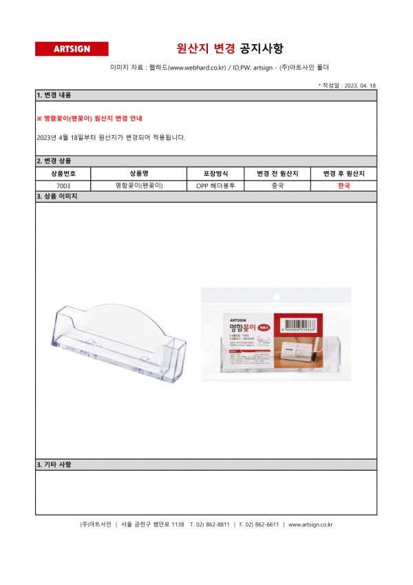 상품변경 ] 명함꽂이(펜꽂이) 원산지 변경