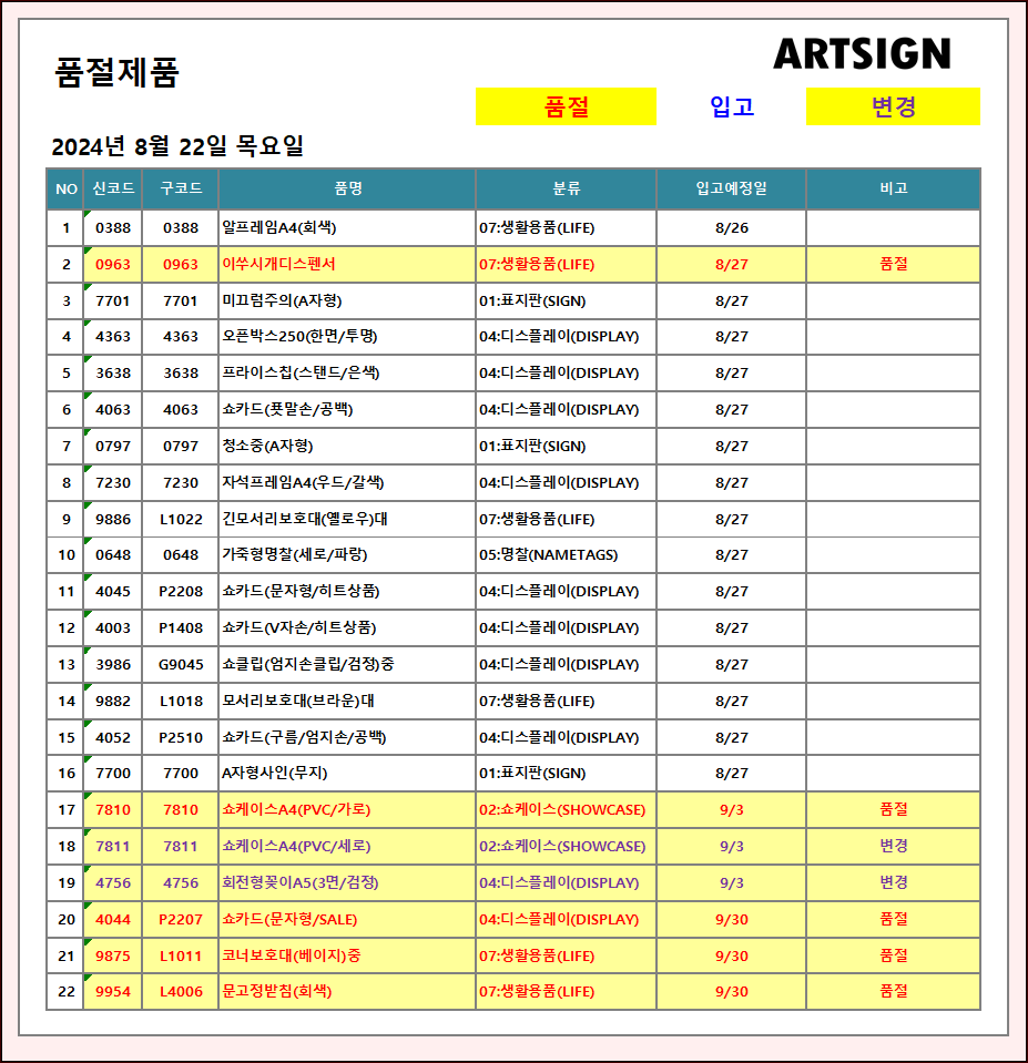 품절 제품과 입고일이 변경 된 제품에 대해 안내 드립니다.