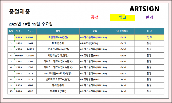 품절 ] 2025년 10월 15일