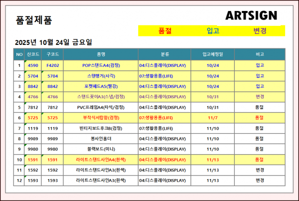 품절 / 입고 / 변경 ] 2025년 10월 24일