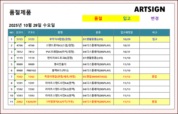 품절 제품과 입고된 제품에 대해 안내 드립니다.
