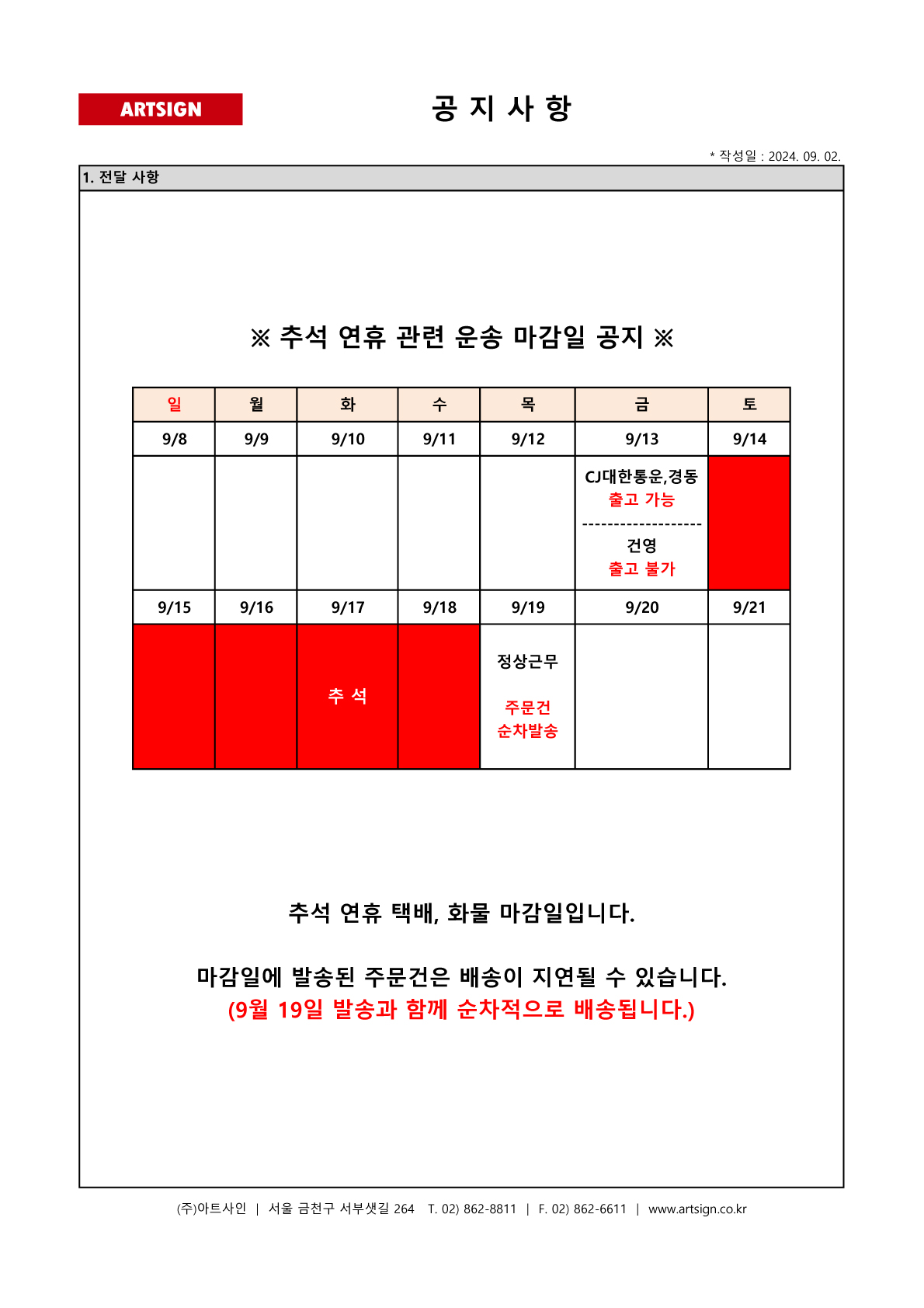 마감공지 ] 2024 추석 연휴 운송 마감 공지입니다.