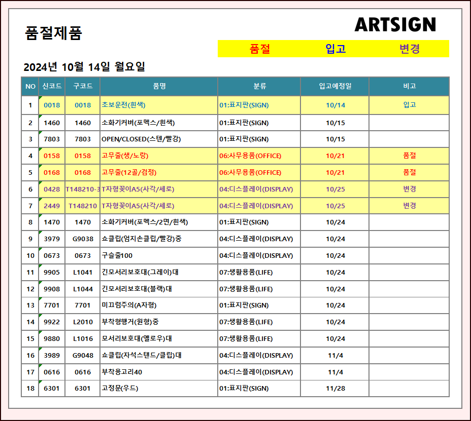 품절 / 입고 / 변경 ] 2024년 10월 14일
