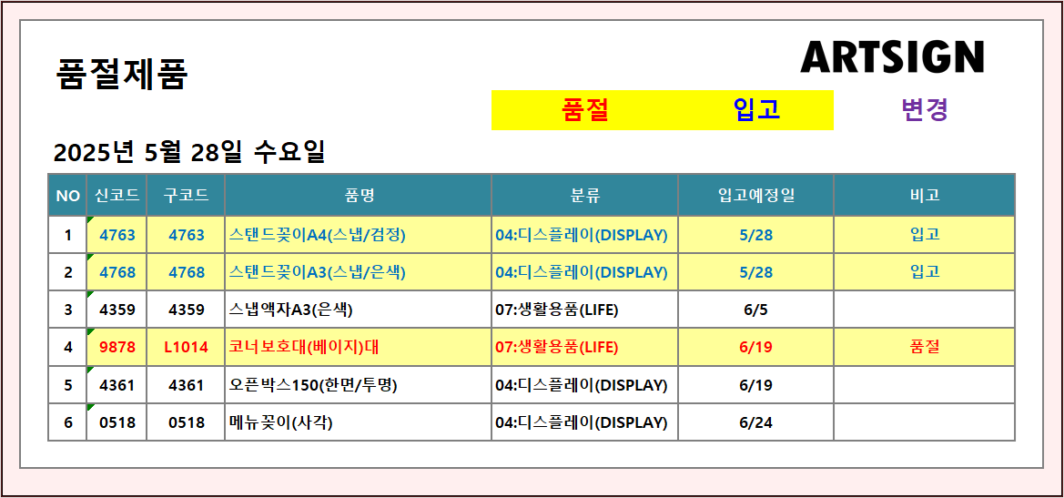 품절 제품과 입고된 제품에 대해 안내 드립니다.