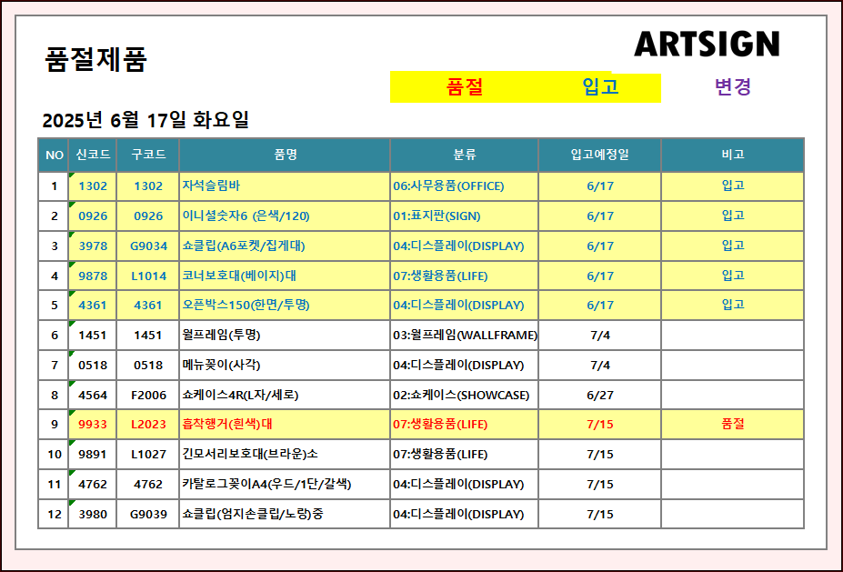 품절 제품과 입고된 제품에 대해 안내 드립니다.