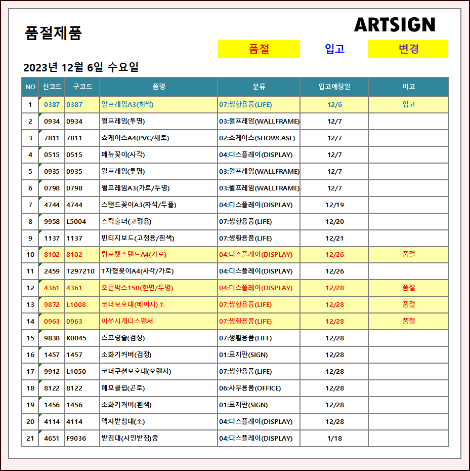품절 / 입고 ] 2023년 12월 6일