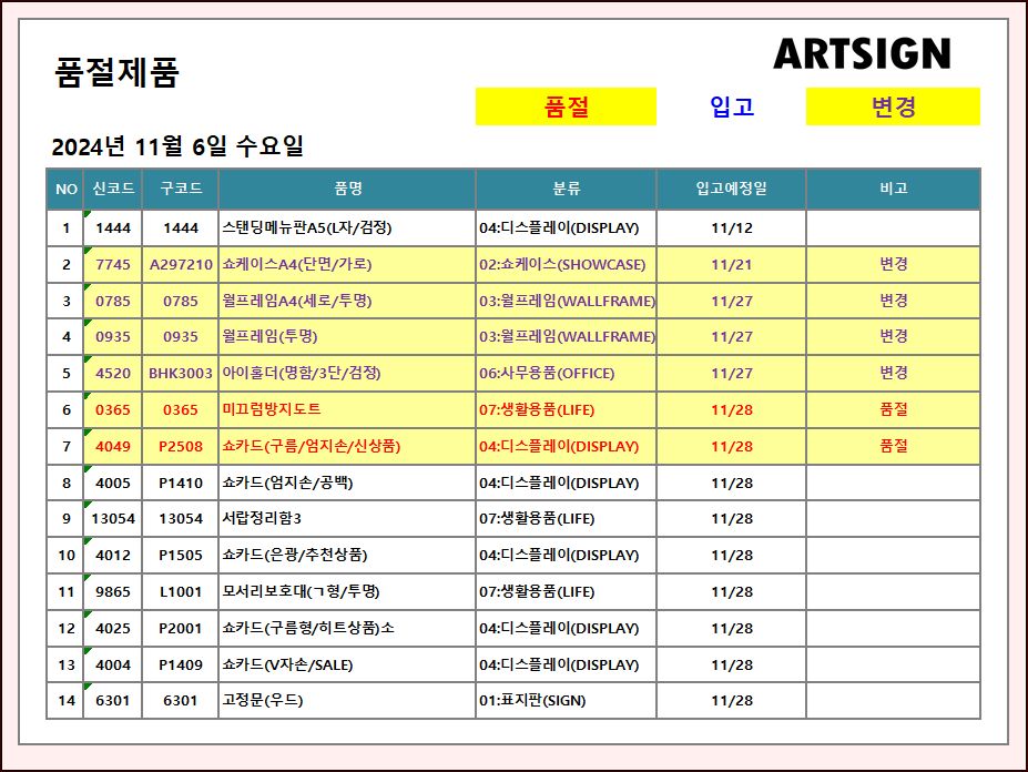 품절 제품과 입고일이 변경된 제품에 대해 안내 드립니다.