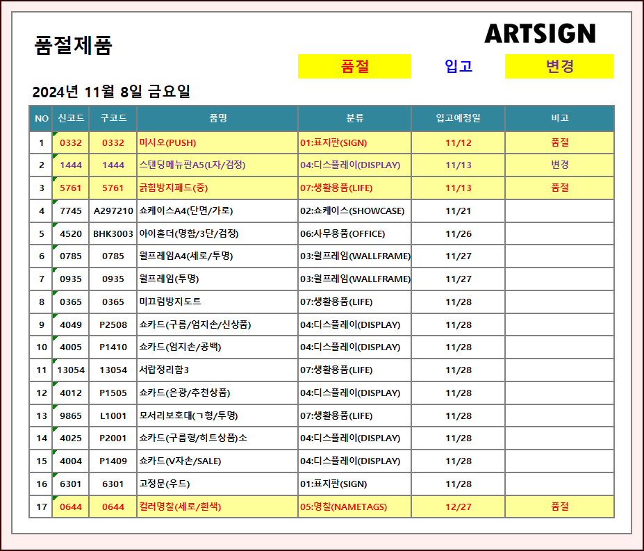 품절 제품과 입고일이 변경 된 제품에 대해 안내 드립니다.