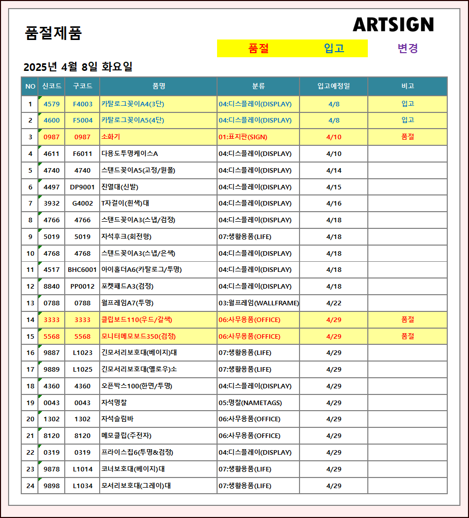 품절 제품과 입고된 제품에 대해 안내 드립니다.