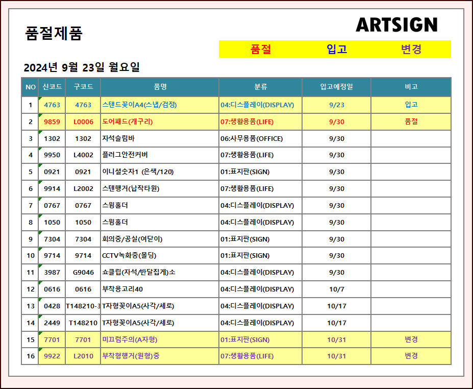품절 / 입고 / 변경 ] 2024년 9월 23일