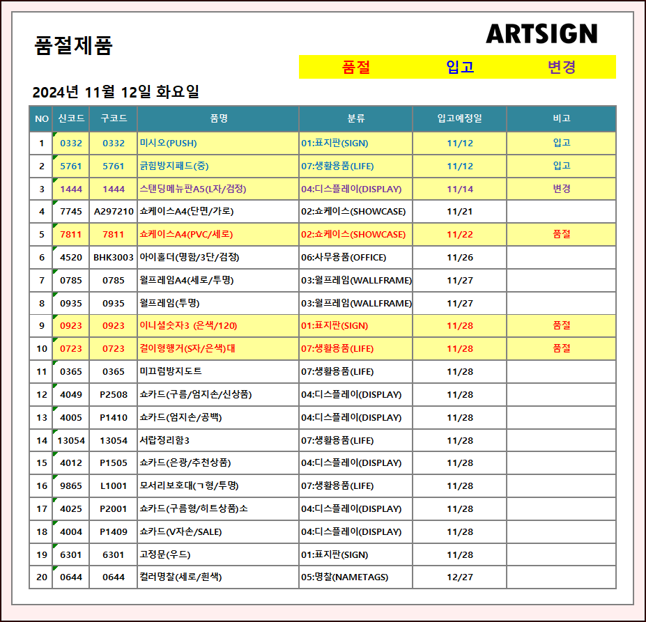 품절 / 입고 / 변경 ] 2024년 11월 12일