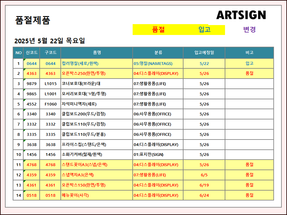 품절 제품과 입고된 제품에 대해 안내 드립니다.