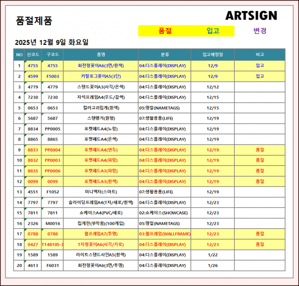 품절 제품과 입고된 제품에 대해 안내 드립니다.
