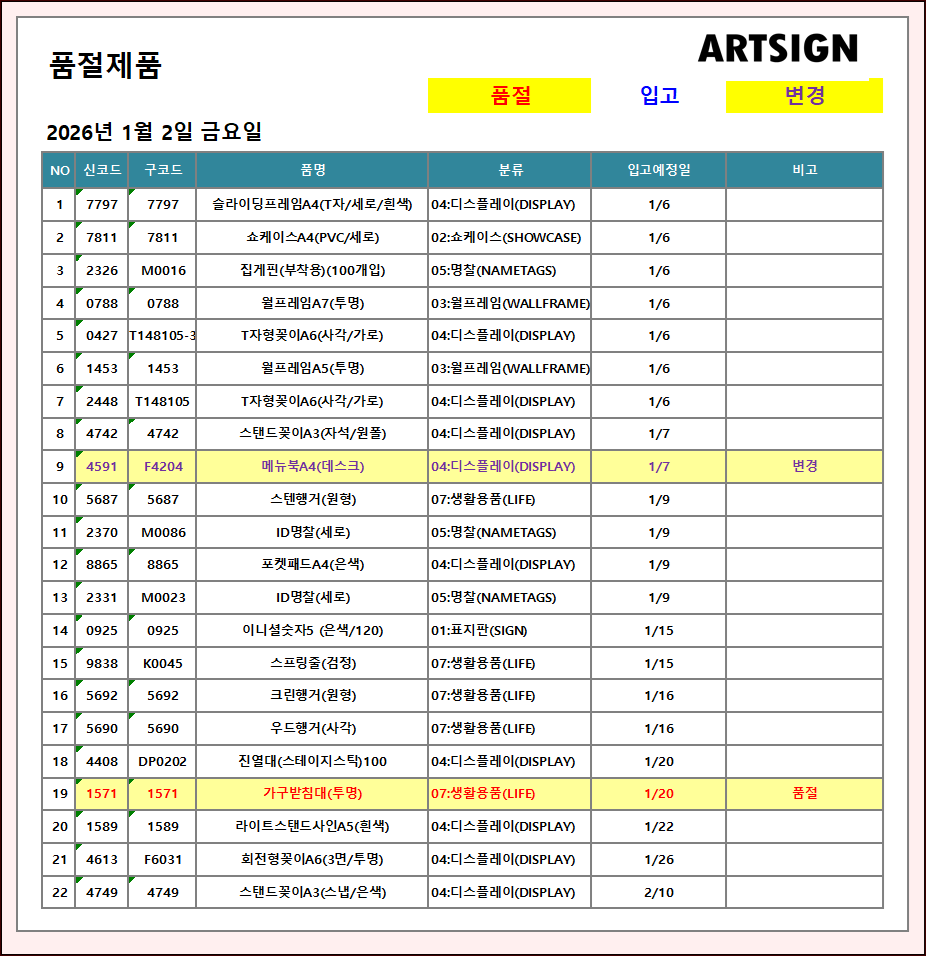 품절 제품과 입고일이 변경된 제품에 대해 안내 드립니다.
