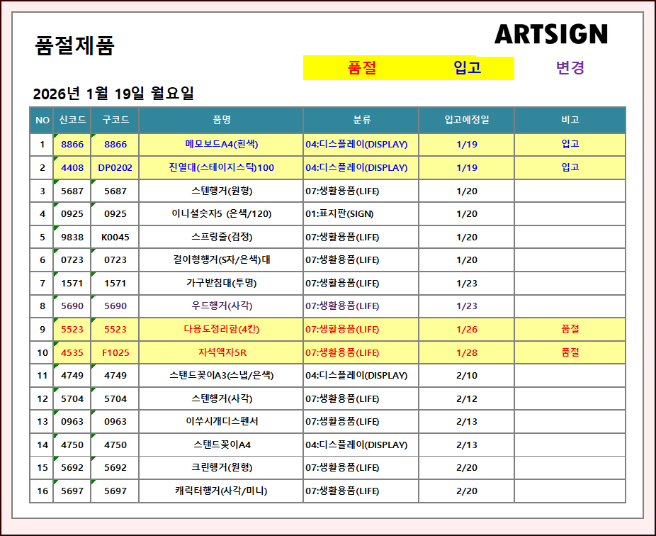 품절 / 입고 ] 2026년 1월 19일