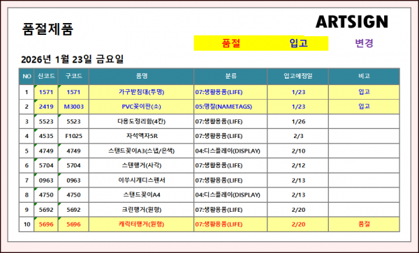 품절 / 입고 ] 2026년 1월 23일
