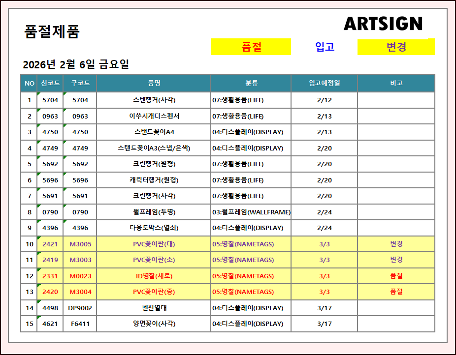 품절 / 변경 ] 2026년 2월 6일
