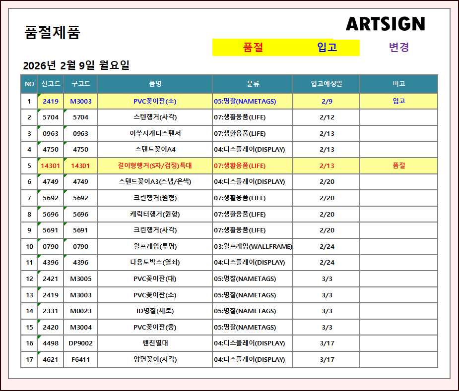 품절 제품과 입고된 제품에 대해 안내 드립니다.