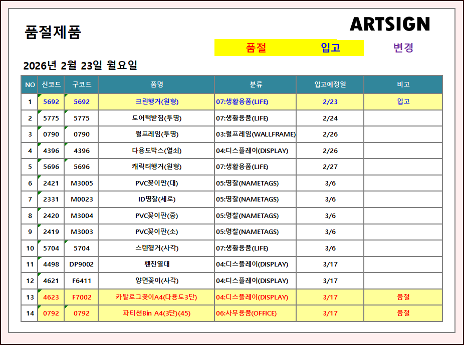 품절 제품과 입고 된 제품에 대해 안내 드립니다.