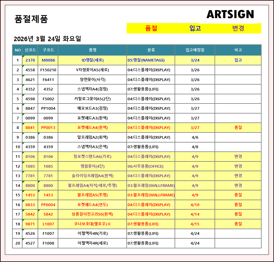 품절 / 입고 / 변경 ] 2026년 3월 24일