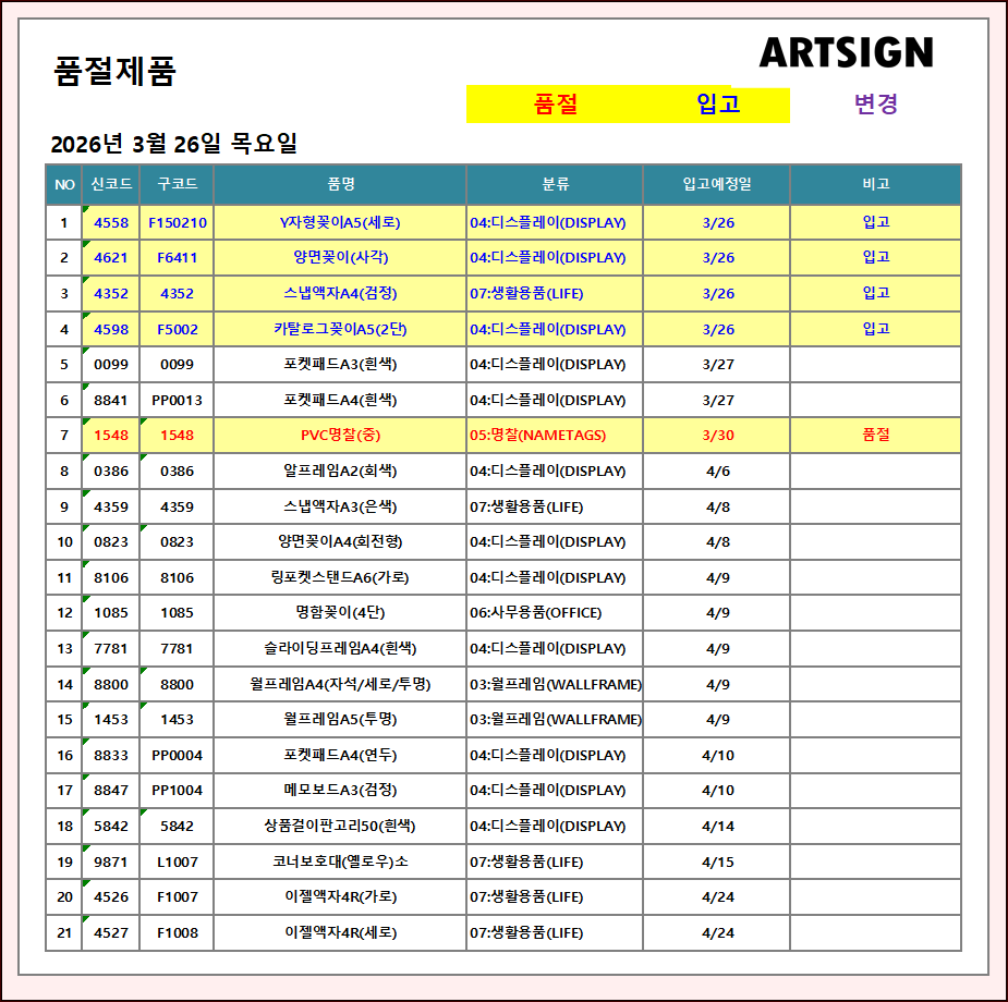 품절 / 입고 ] 2026년 3월 26일