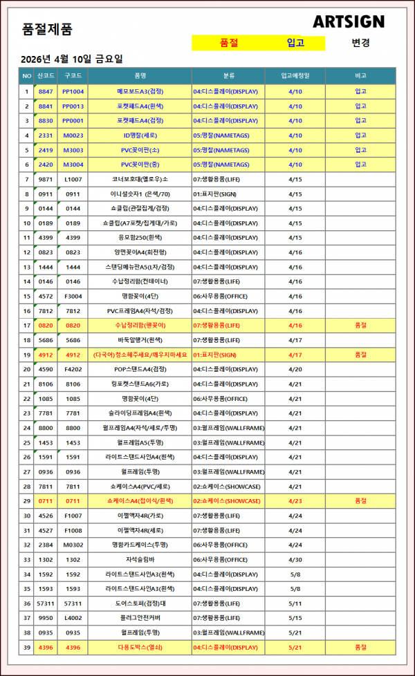 품절 / 입고 ] 2026년 4월 10일